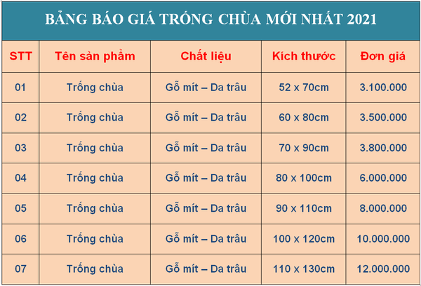 Bởi có rất nhiều kích thước và mẫu mã khác nhau nên Giá trống chùa cũng không giống nhau mỗi loại có một loại giá riêng. Để khách hàng có thể lựa chọn dễ dàng các mẫu cúng tôi đã làm một cách chi tiết như sau.